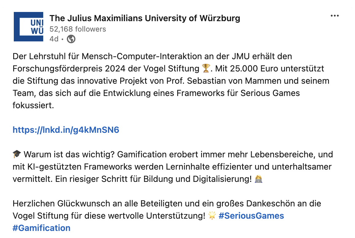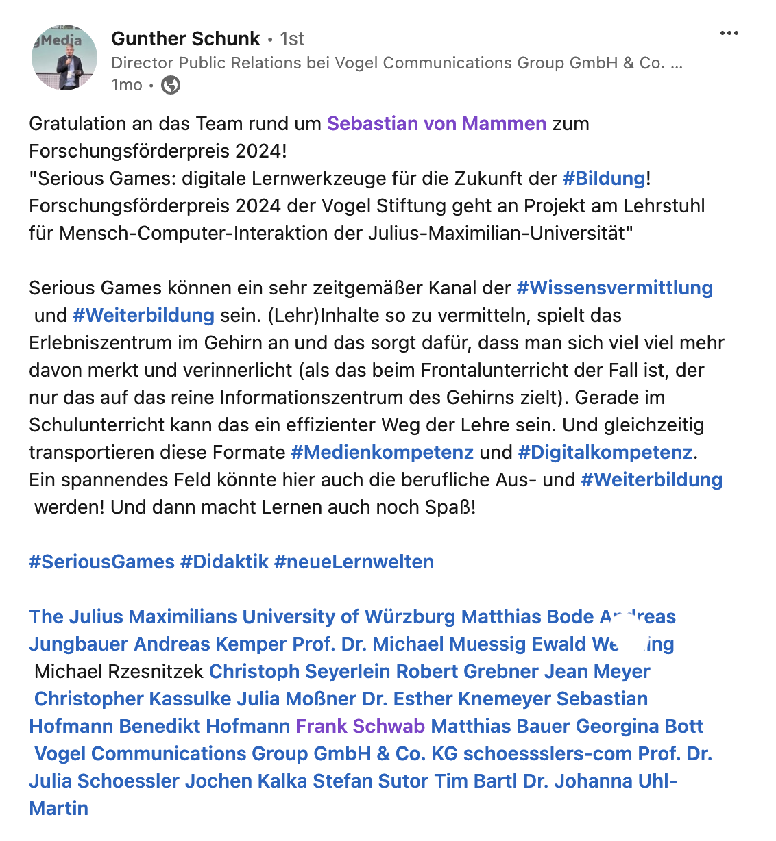 Last month, we were honored to receive the 2024 Research Award from the Vogel Stiftung. It is gratifying to see our work recognized, as it brings attention to this exciting field of research and encourages us to continue making meaningful contributions.