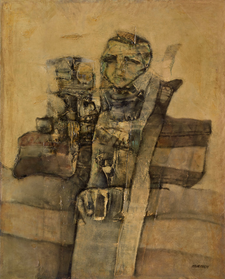 Created in 1983, this oil on canvas (100 x 81 cm) exemplifies Issiakhem’s exploration of abstract forms and oblique angles.
